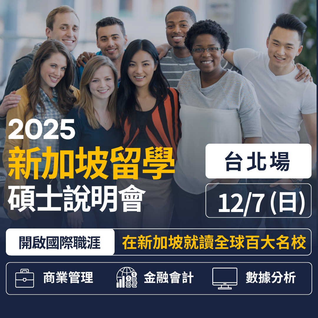 新加坡 × 全球百大碩士說明會|解鎖國際職涯新高度! 你是否正在規劃深造,卻希望兼顧學費效益、學歷認證以及職涯發展? 現在只需4小時,從台灣直達新加坡🇸🇬,輕鬆一年攻讀全球百大碩士學位🌏